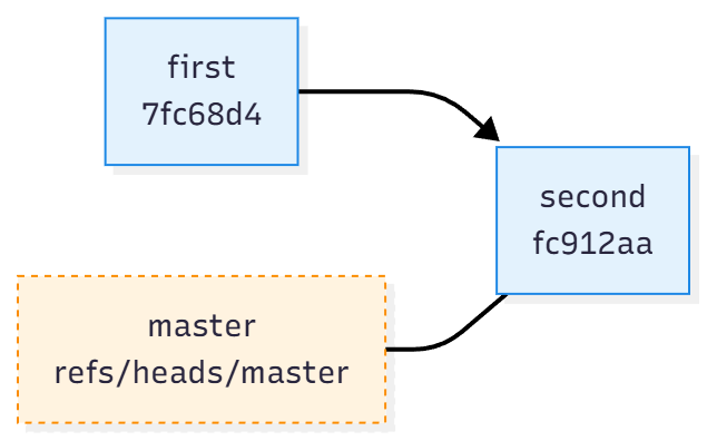 여기서 parent 필드를 주목해야합니다. first 커밋은 최초 커밋으로 부모 커밋이 없으며, second 커밋은 first를 부모로 가리키고 있습니다.