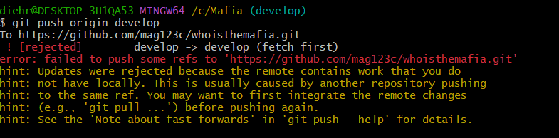 hint: See the 'Note about fast-forwards' in 'git push --help' for details.