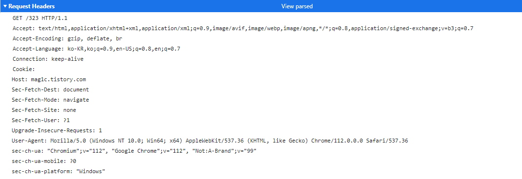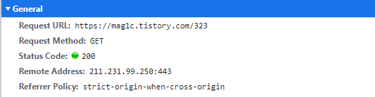 https://mag1c.tistory.com/323 페이지 접근 시의 요청과 응답 정보를 담고 있는 헤더이다.