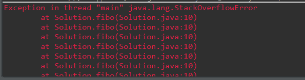 현재 알고있는 값은 0번째와, 1번째의 값 뿐이기 때문에, 결국 F(1)까지 호출이 되어 순차적으로 해를 구할 수 있는데, 이렇게 되면 stack에 F(10000), F(9999), F(9998) ............... F(1)까지 채워지게되고, 결국 limit을 초과하여 StackOverFlowError가 발생하게 된다.