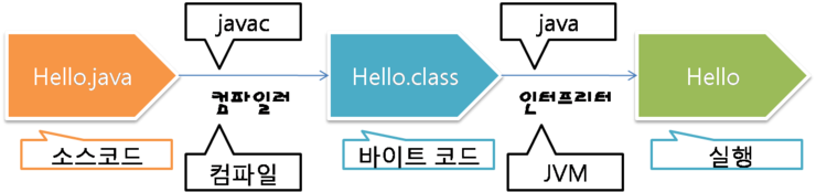 | 1. 개발자가 .java 소스파일을 작성 2. 컴파일러로 바이트 코드 파일을 작성 3. JVM 구동 명령어로 실행 |