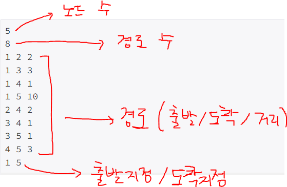 위 포스팅의 백준 1916번 문제를 예시로 들어 다익스트라 알고리즘을 구현해보자.