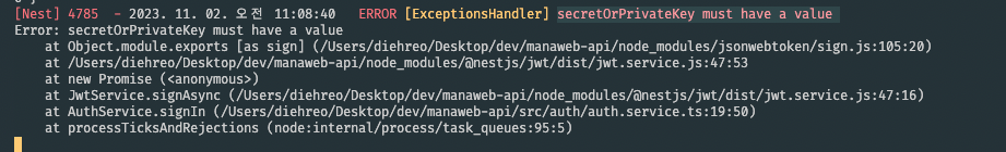 .env에 작성해 둔 JWT_SECRET이라는 이름의 환경변수를 읽는 과정에서 발생한 에러로 JWT 토큰 발행 시 반드시 secret key가 있어야 하는데 읽지를 못한 것으로 보인다.