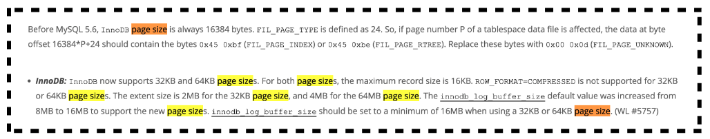 InnoDB의 경우 페이지 크기는 16KB로 고정되어 있었지만, 공식 문서에 따르면 MySQL 5.7.6 이후부터는 페이지 크기를 32KB, 64KB로 설정하는 것이 가능하다고 한다. 하지만 한 레코드의 크기는 16KB로 여전히 제한된다고 한다.