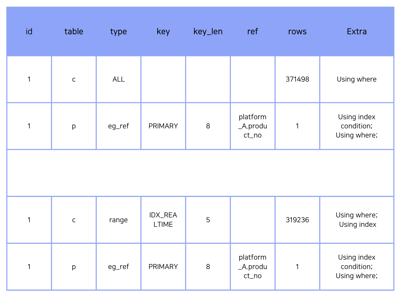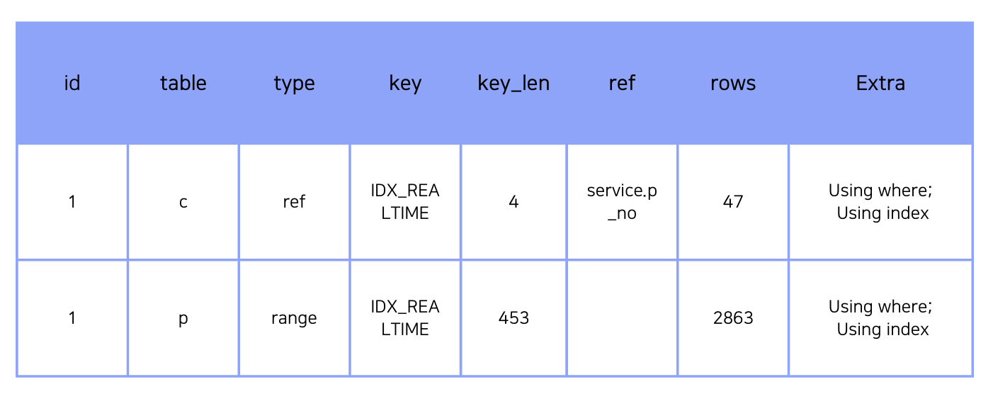 변경 후에도 결과가 다소 개선되었는데 Duration도 개선되었지만 Fetch Time이 대폭 개선되었음을 볼 수 있다. 실제로 스캔하는 row의 수가 100배 가까이 줄었기 때문이라고 유추해 볼 수 있었다. 추가로 c 테이블의 KEY LENGTH가 1이 줄었는데, 이 쿼리의 결과에서 option_product을 참조하지 않았다고 판단할 수 있다. (option_product는 tinyint이다)