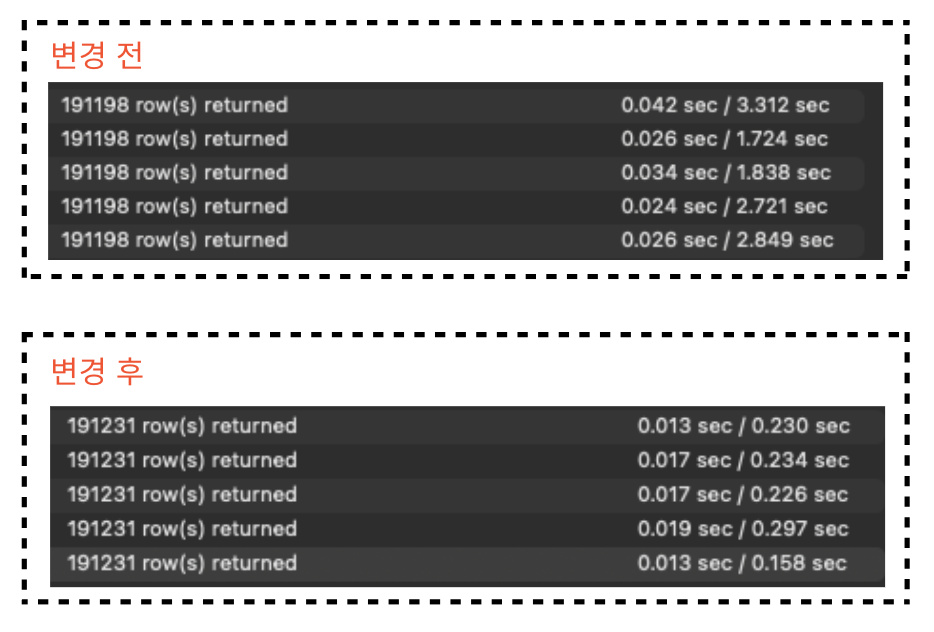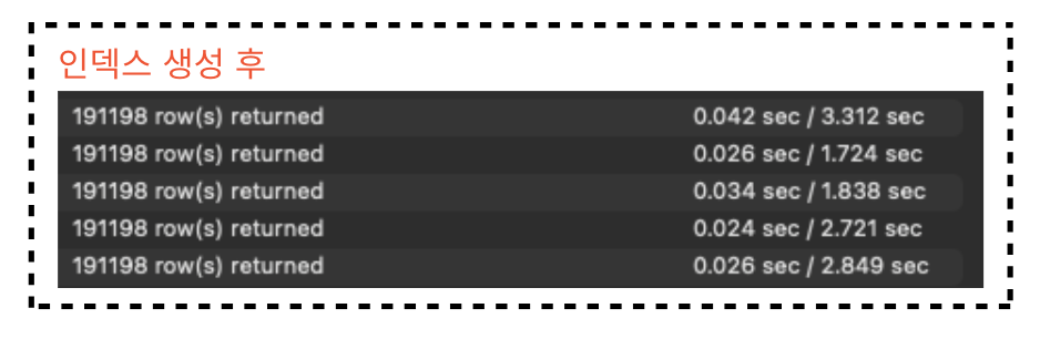인덱스 생성 후에는 INDEX RANGE SCAN을 통해 조회하였고 테이블 row의 스캔 개수도 20%가량 줄어들었다.