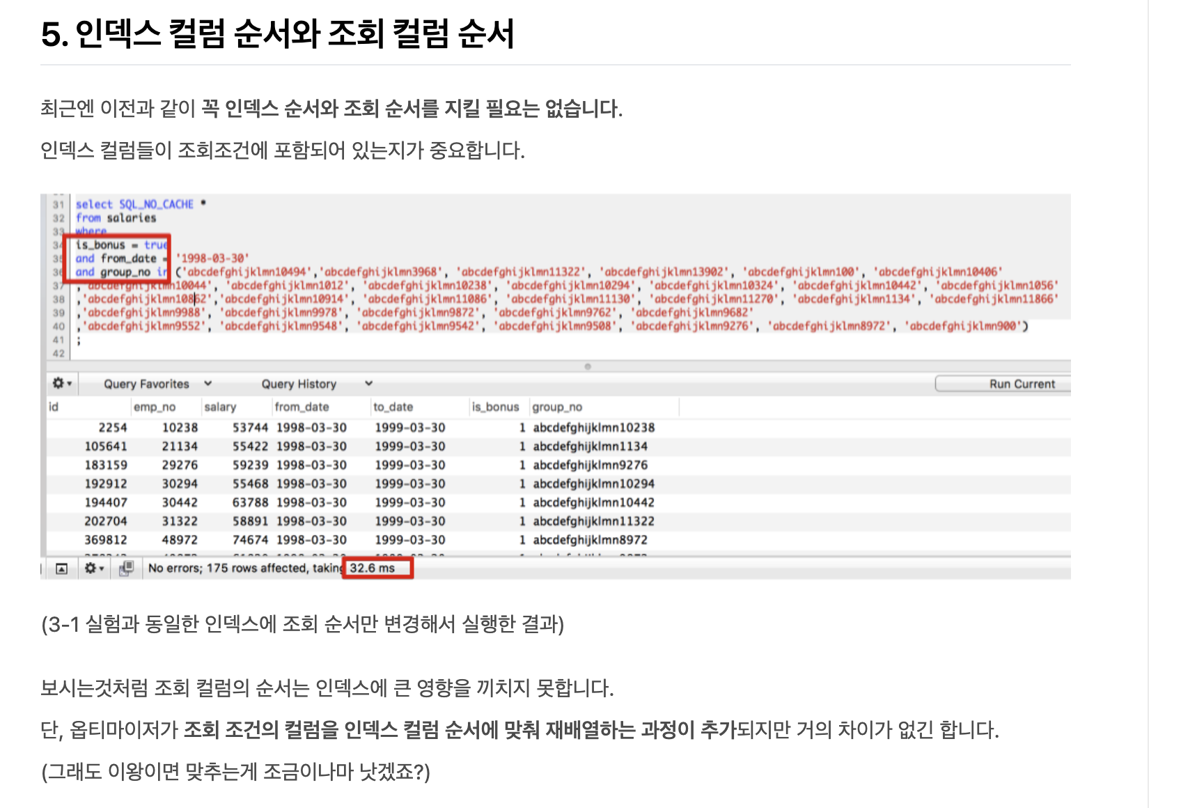 최근엔 이전과 같이 꼭 인덱스 순서와 조회 순서를 지킬 필요는 없는 것 같다. 인덱스 컬럼들이 조회 조건에 포함되어 있는지가 중요하고, 내가 사용하고 있는 데이터베이스 엔진에 맞게 인덱스를 활용하고 튜닝할 줄 아는 게 중요한 것 같다.