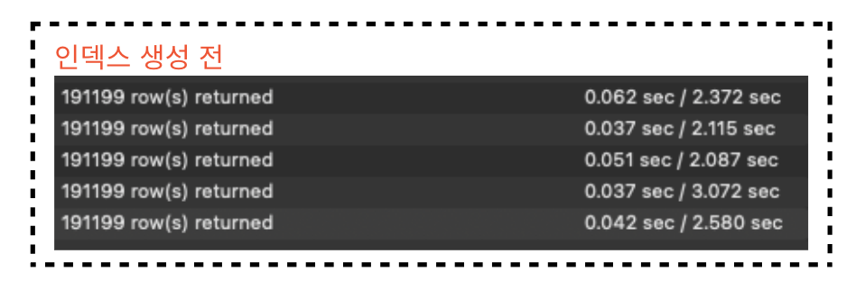 인덱스 생성 전에는, 해당 테이블에서 풀스캔(ALL)을 했다. 전체 테이블 row를 스캔한 것으로 보인다.