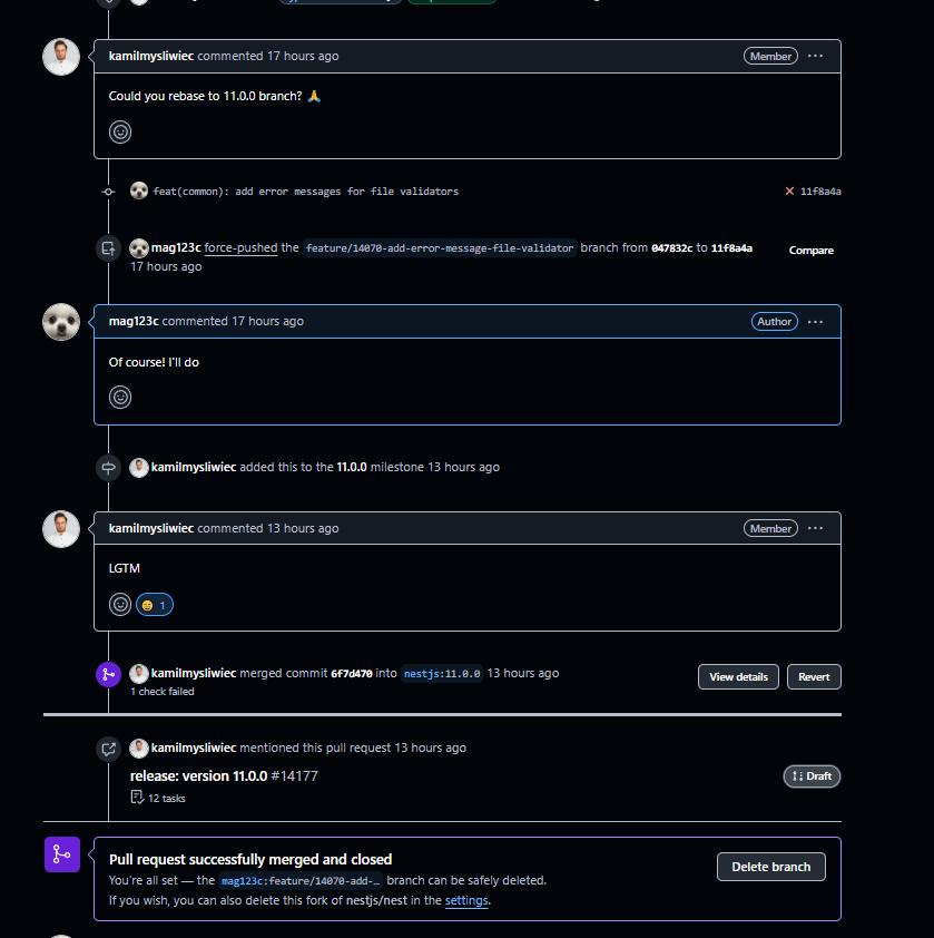 누군가가 PR을 하겠다고 코멘트가 달려있어서 선택하지 않았던 이슈였지만 누가 먼저 PR을 보내느냐가 중요하다던 말이 떠올랐다. 간단한 이슈였기 때문에 바로 PR을 보냈고, 곧바로 머지 되었다.