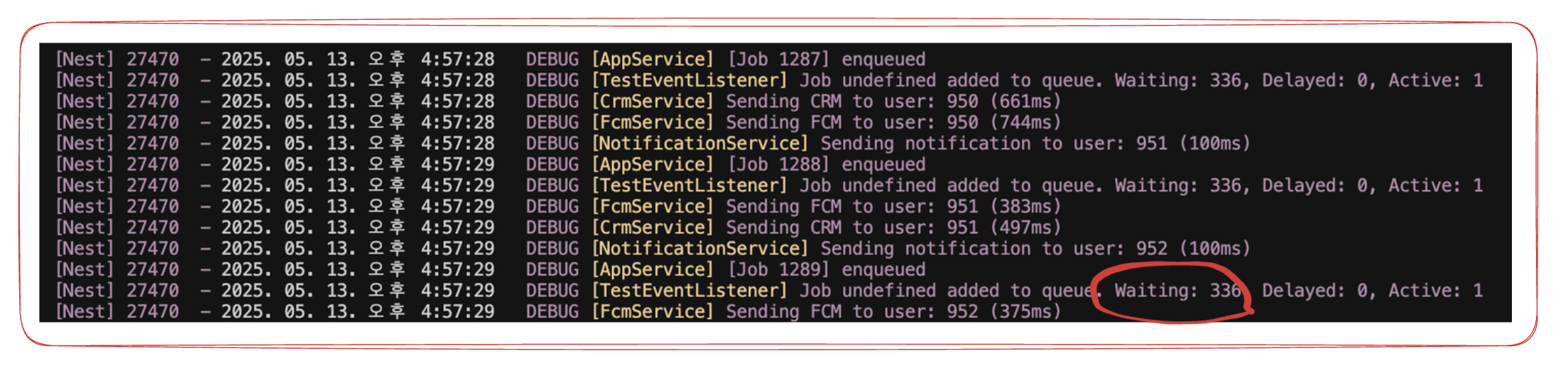 메시지 전송 로직과 분리하여 비동기 처리를 수행하기 위해 BullMQ라는 메시지 큐를 사용했다. Kafka나 RabbitMQ 등도 Nest의 공식 문서에 UseCase등을 문서화해뒀는데 사용하지 않았다. 이들을 사용하기에는 발톱의 때 만큼의(?) TPS였다. 또 Nest에서 기본적인 Queue 사용문서 에 친절하게 언급되어있는 BullMQ의 실패 시 재시도와 스케줄링과의 연동, 이벤트 기반 처리와 이벤트 리스너를 통한 통합 로깅 등을 구현하기에 용이했기 때문에 BullMQ를 사용했다.
