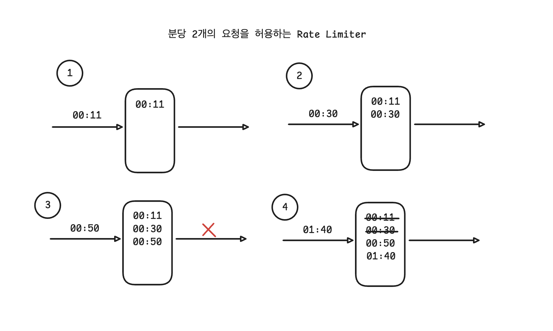 예: 1분에 100회 제한인데 00:59에 100회, 01:00에 100회 요청이 오면 2초 동안 200회 처리가 필요하다. - 짧은 시간 내 몰리는 트래픽을 균등하게 제어할 수 없다.