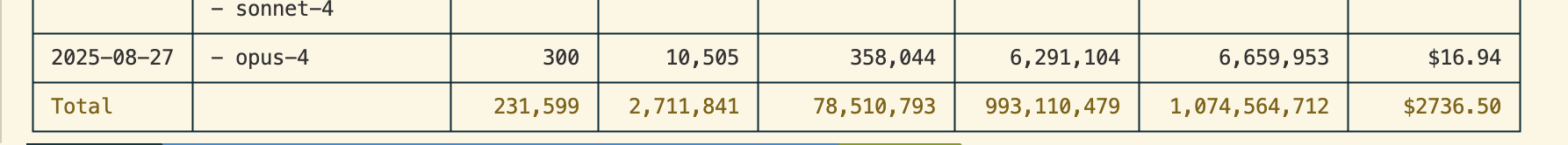 ccusage도 잘 동작합니다. 위 사진이 개인 계정(내용이 많아서 짤랐습니다.), 아래가 회사 계정이에요.