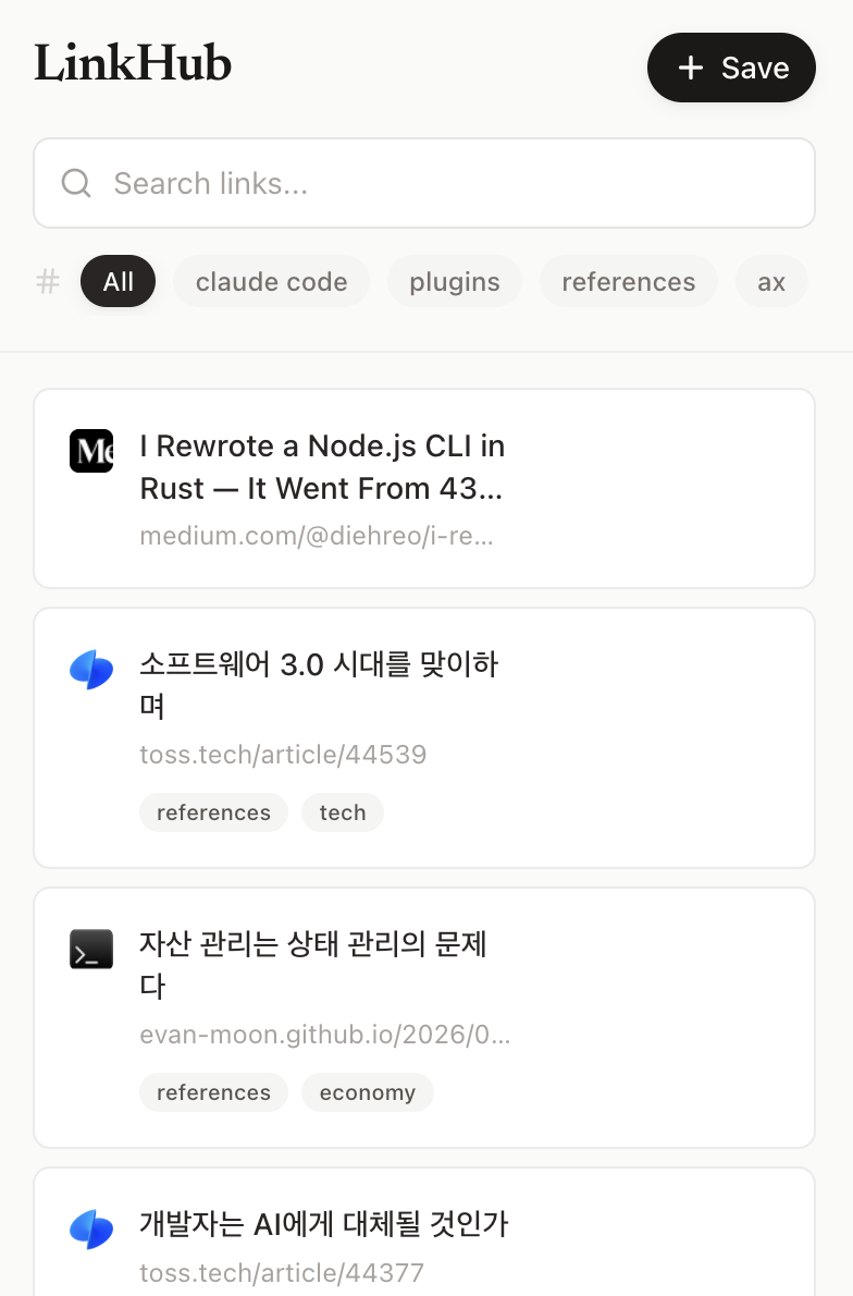링크 형태의 레퍼런스들을 많이 가지고있는데, 기존에는 카카오톡 나와의 채팅에 보관하다가 Linko라는 개인 앱을 만들었다.