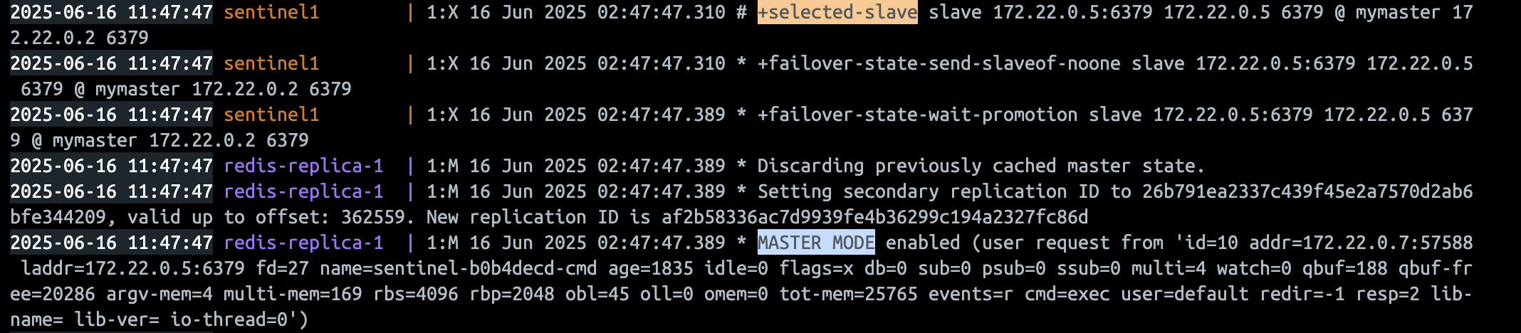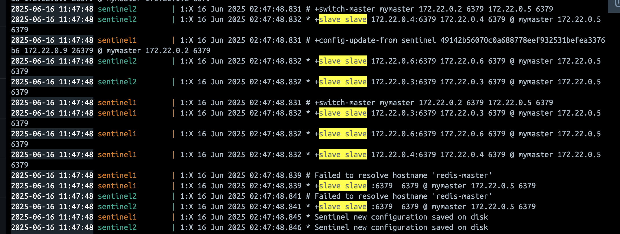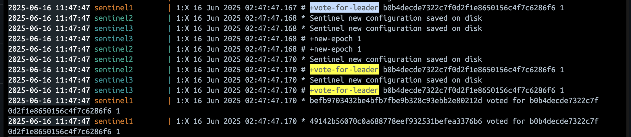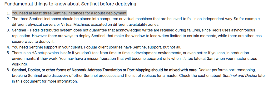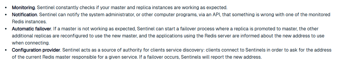 다시 정리하고 넘어가자면, Sentinel을 분산 배치하는 이유는 장애 감지의 신뢰성 확보와 더불어 자체 장애에 대한 복원력 확보에 있다. 특정 Sentinel의 오탐지로 잘못 바뀌는걸 방지하며, Sentinel이 죽더라도 다른 Sentinel들이 감시를 이어갈 수 있기 때문이다.