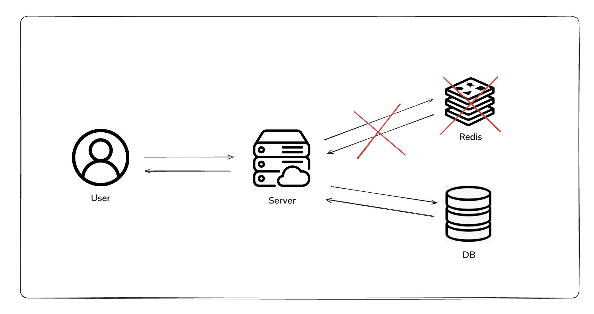 보통의 이런 캐싱 전략에서, 정해놓은 주기가 만료된 후의 최초 요청에서는 캐싱된 데이터가 Redis에 존재하지 않기 때문에 DB Fetching 후 Redis에 적재하는 일련의 과정을 거친다. 만약에 이 Redis에 문제가 생겨서 Redis 서버가 다운됐다고 가정해보자.