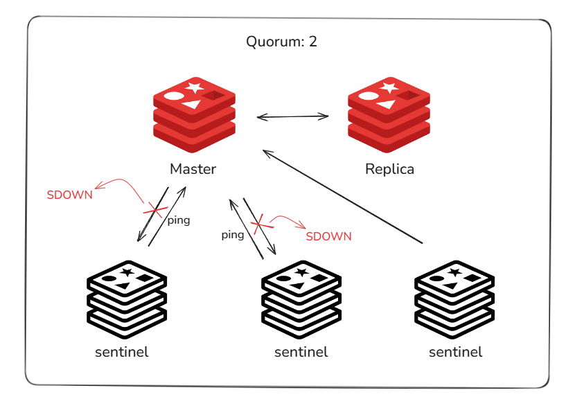 우선 각 Sentinel은 개별적으로 ping을 보내 상태를 감시하는데, 이 때 응답이 없다면 SDOWN으로 간주한다.
