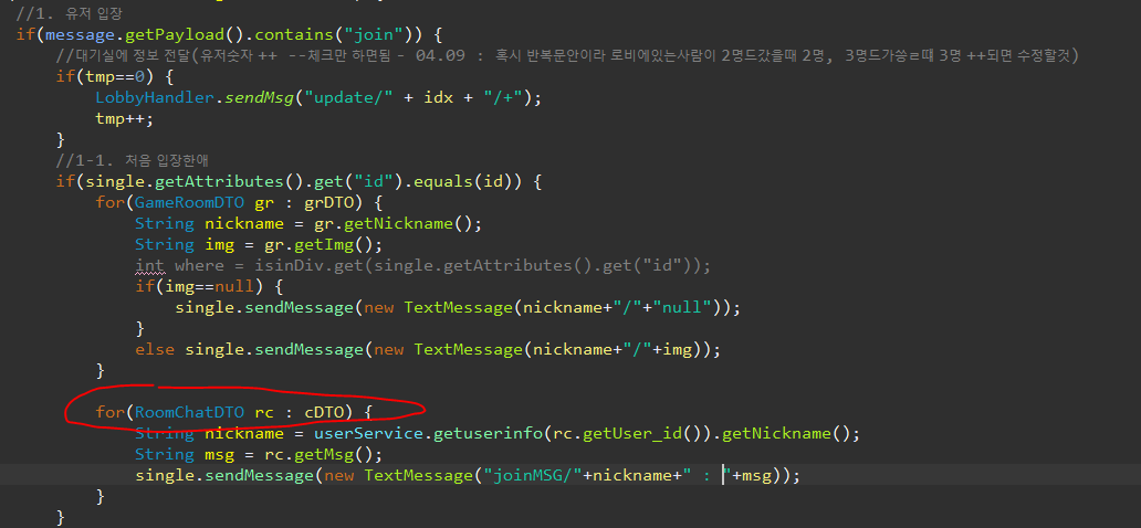 기존에 RoomDTO하나에서 모든걸 해결하다가, RoomDTO, RoomChatDTO, GameRoomDTO 세 개로 나눠서 코드를 작성하기 시작했는데, 그 과정에서 코드 수정이 덜 이루어져서 List안에 RoomDTO객체까지 들어가버려서 에러가 발생한 듯 했다.