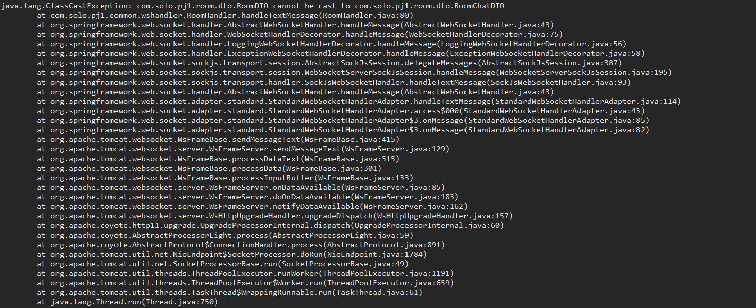 발생 경위 WebSocket을 활용한 마피아 게임 제작 개인 프로젝트 중 아래의 에러가 발생했다. 게임방 입장 시 발생한 에러 에러 발생 경로를 쭉 따라가니 아래의 표시된 부분에서 에러가 발생했다. 무언가 캐스팅을 하지 못해서 발생한 에러인가보다 라고 생각했다. 해결 방법 List 컬렉션 안에 RoomChatDTO객체만 들어오는지 확인하러 떠났다. 기존에 RoomDTO하나에서 모든걸 해결하다가, RoomDTO, RoomChatDTO, GameRoomDTO 세 개로 나눠서 코드를 작성하기 시작했는데, 그 과정에서 코드 수정이 덜 이루어져서 List안에 RoomDTO객체까지 들어가버려서 에러가 발생한 듯 했다. 해당 코드를 RoomChatDTO 객체를 반환하게 고쳐주었더니 잘 돌아갔다.