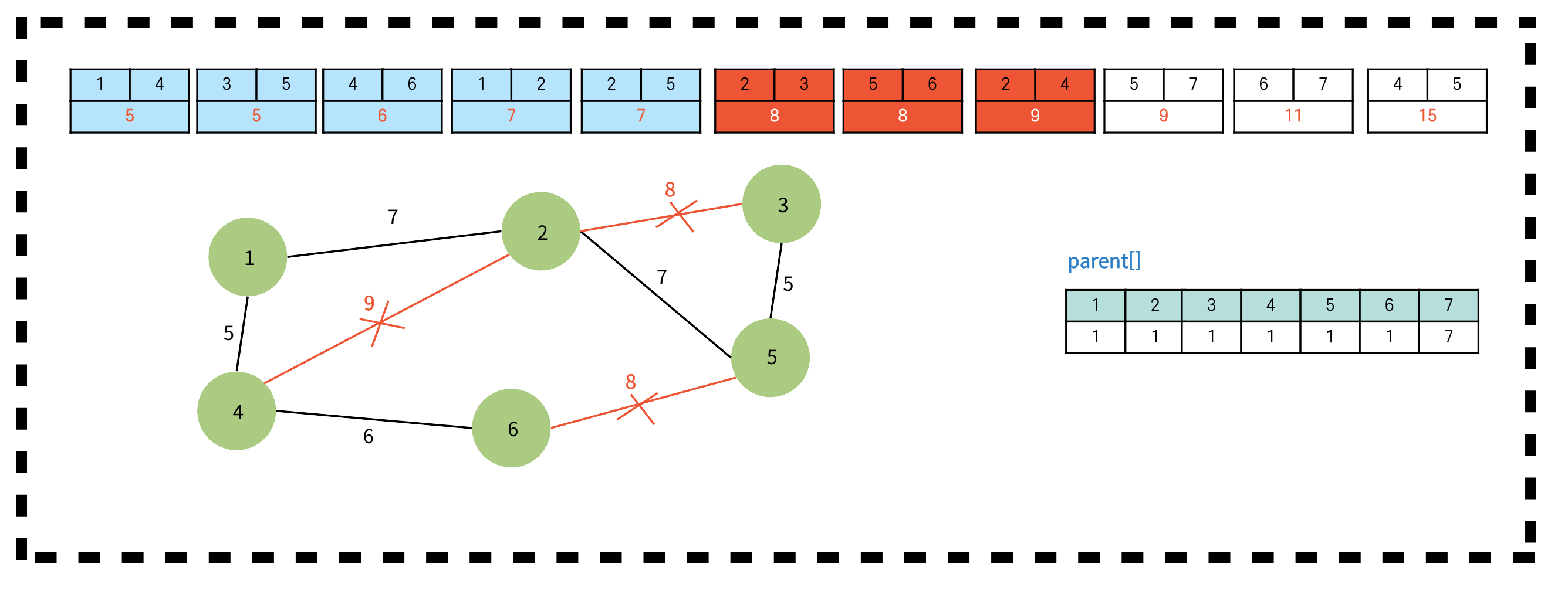 마지막으로, 연결되지 않은 노드들의 가중치를 바탕으로 최소 신장 트리를 만들면서 문제에서 요구하는 가중치를 구한다.