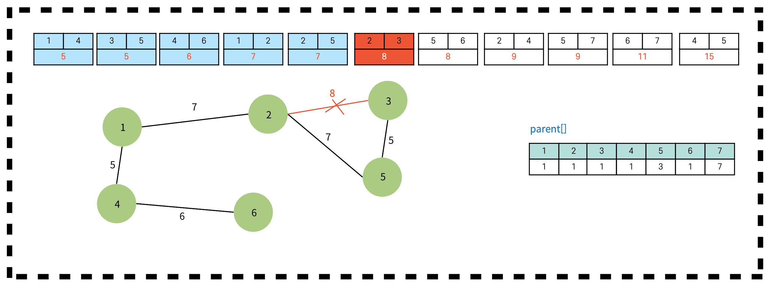크루스칼 알고리즘 (Kruskal Algorithm)크루스칼 알고리즘(Kruskal Algorithm)이란 최소 신장 트리(Minimum Spanning Tree)를 찾기 위해 사용되는 알고리즘이다. 신장 트리(Spanning Tree)그래프 내의 모든 정점을 포